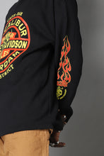 Harley Davidson sweatshirt with HD logo printed on the front in yellow/red colour way with "Excalibur Cafe Amsterdam Red Light District" inscribed across the chest. Has red fire graphic printed on both sleeves with logo below it. Sweatshirt comes with long sleeves, oversized fit and sits longline with side split vents.