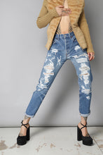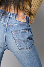 Embrace the returning grunge look with these distressed blue 501 Levi's jeans. These are ripped down the front for a distressed look with some slight colour fading for that grunge aesthetic. Features front and back pockets with classic logo patch on back of waistband. Jeans have straight leg fit and sit mid waisted. Has button closure on the front.