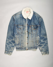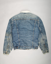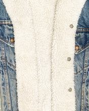 Keep warm 80's style with this distressed grunge Levi's jacket. Made from blue acid-washed 100% cotton denim with extra warm layer of cream sherpa lining which creeps out onto the collar. Features all classic Levi's jacket attributes such as two slide-in hand pockets and branded buttons on the two front pockets, cuffs and all up the front fastening.