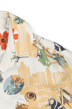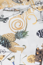 Crazy patterned Hawaiian shirt by Pierre Cardin- features fishies, pineapples, vintage cars & cocktail prints all over. Button down front, front chest pocket and loose flowing fit with short sleeves.