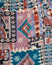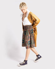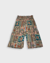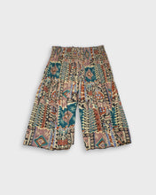 These '70s vintage knee length shorts come in a lightweight fabric and feature an aztec-style print and a gathered elastic waist.