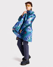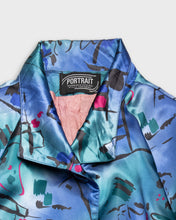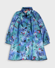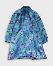 This '80s vintage satin coat features an abstract print on a cloud-like multi-blue background. The shape says 60s but the pattern says 80s, so you decide what mood you're in!