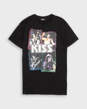 This vintage crew neck t-shirt comes in a shade of black and features a print of the band Kiss consisting of a picture of each member during a concert and their famous logo.