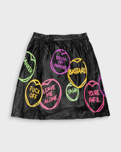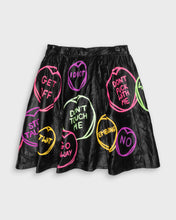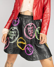 Don't be shy! Make a statement with this unique hand painted Freak Boutique black leather flared skirt emblazoned with florescent slogans with attitude! This XS/S item features concealed zip and button fastening. Say it how it is!