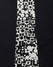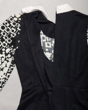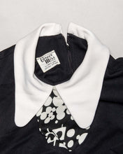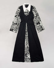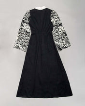 Make a statement with this glorious fit and flare '70s maxi dress from Carla Jane. Resembles an overall dress in that it has an under dress with an attached dress on top. The underdress is decorated in a beautiful black and white '70s print and has long flared sleeves and a typical exaggerated '70s collar. The over-dress is a black scoop neck with a semi-structured bust which cinches in at the waist and then flares out to floor length with a long central split revealing the pattern of the underdress. Rear zip fitting. Truly a statement piece!