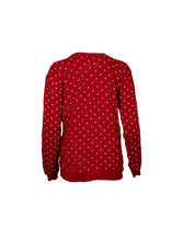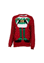 Christmas jumper featuring Elf pattern design beginning directly beneath the round neckline giving the illusion that the wearer is the elf. Has white polka dot detailing, long knitted sleeves and round neck collar
