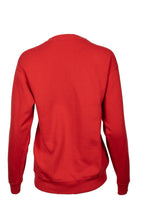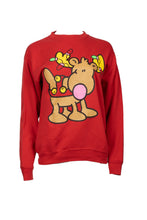 Christmas jumper, red with brown/yellow/pink reindeer design on front. Round neck collar and long comfy sleeves.