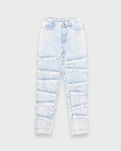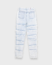 These vintage high waisted 90's jeans come in a light blue, 2 tone denim wash and feature frayed panels on the front and back.