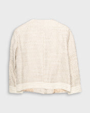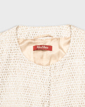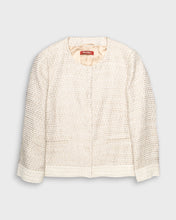 Add a touch of sophistication with this Max Mara crocheted style evening jacket. It comes in a soft ivory colour and has two mock pockets and a button up front. It also features shoulder pads plus gorgeous tiny floral detailing on cuffs and hem.