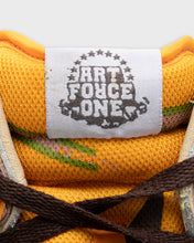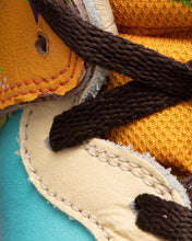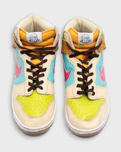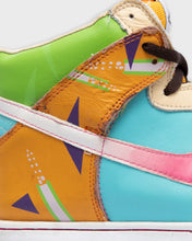 These multicoloured high top dunks are fun and colourful. They have a patent leather Nike tick that transitions from a white gloss to a matte pink and there is also an orange section that is covered in a Memphis style print - totally 80's!