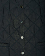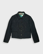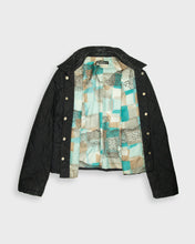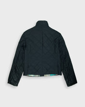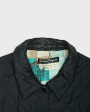 Salvatore Ferragamo padded lightweight jacket in classic navy. Silky quilted fabric with turquoise/gold animal print lining, two slide-in hand pockets, classic collar and branded buttons.
