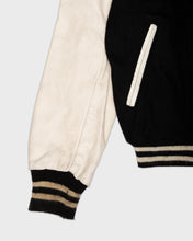 This chunky black and white varsity jacket is perfect for Autumn/Winter months. With white leather sleeves, striped trim and textured appliqué lettering on the back, it is a classic piece of Americana for your wardrobe.