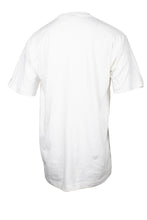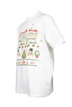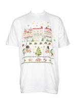 White short sleeved Christmas t-shirt with festive design in red, gold and green featuring snowmen, houses and Christmas trees.