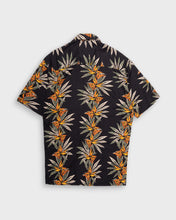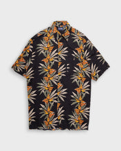 This vintage short sleeve shirt features a bird of paradise floral print on a black background, a front pocket and tonal buttons.