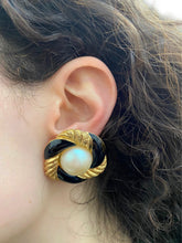 Pearl centre with wrap style surrounding design featuring black and gold detailing. Has gold clip on backing.