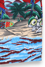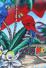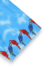 Short sleeved striking blue Hawaiian shirt with beach scene print including palm trees, parrots and surfboards. Parrots sitting print along both sleeves. Button down front and single chest pocket.