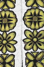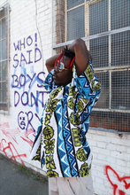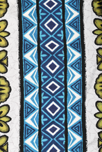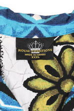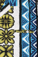 Classic Hawaiian shirt with thick blue and white vertical striped panels featuring blue/white abstract patterns and yellow floral designs. Featuring short sleeves, a button up front, left breast pockets and lapels with a collar.