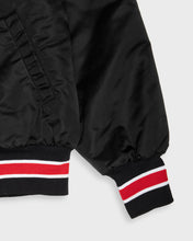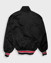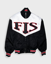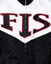 90's FIS black padded Varsity jacket with white upper body featuring FIS branding in black/red trim. Has two slide-in hand pockets, white front zip and ribbed black cuffs, hem and collar with red/white stripes.