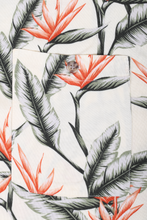 Light yellow Hawaiian shirt with all-over floral design of orange flowers with green foliage. Short sleeved, button up front, left breast pocket with collar and lapel.