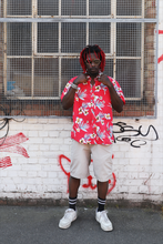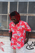 Striking Hawaiian shirt in magenta pink with blue/yellow tropical floral print all over. Has button down front, chest pocket and short sleeves.