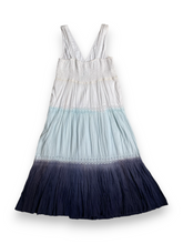 Long white sleeveless summer dress with cross-over elasticated upper body, cinched waist and flowing hem with gradient fading from white to light blue to navy. Has gorgeous lace trimming.