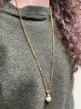 Gorgeous single pearl drop necklace with long golden chain. Has lobster clasp closure.