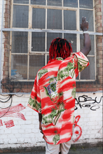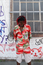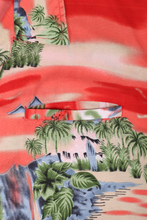 Red Hawaiian shirt with green and blue oasis scene all-over repeated pattern. Short sleeved, button up front, left breast pocket with collar and lapel.