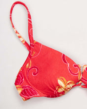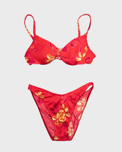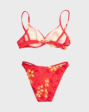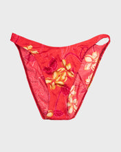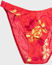 Be a hit at the beach in this eye-catching swim suit by '90s Athena. Comes in classic stretch fit in pillar-box red with lovely gold floral print. Top is underwired and lightly padded with spaghetti straps and a rear clasp. Bottoms are high thigh.