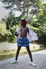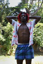 Cool light blue Hawaiian shirt from Tommy Bahama featuring all-over small blue grid design with red flowers.
