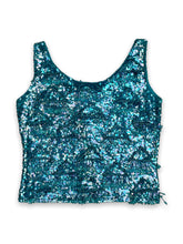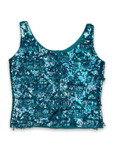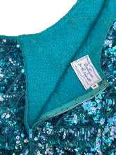 Stunning turquoise sleeveless sequin top. Made in wool hand loomed with sequins and beaded tassles all over. Zipper closure at rear with extra hook closure at the top. Original Vintage 1950/1960s by Jo-Ro Imports.