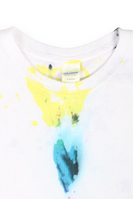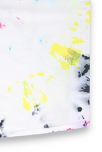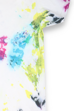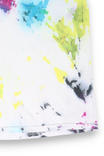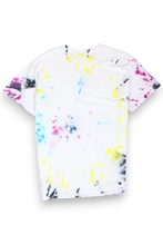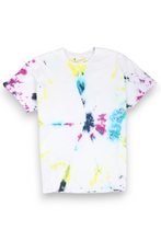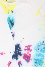 Grunge '90s white T-shirt with blue, purple and neon yellow tie-dye splatters all over. Round neckline and short sleeves in soft cotton material.